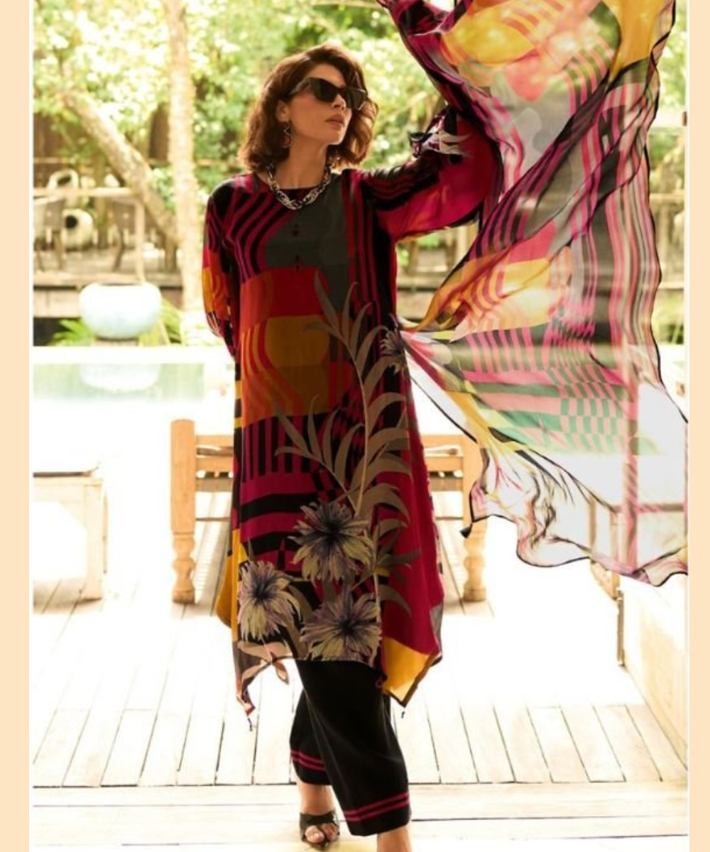 Make a bold fashion statement with this Black Abstract Multicolor Royal Silk Suit. Designed for modern women, this outfit features striking abstract patterns over a rich black base. The premium silk fabric adds a touch of luxury while ensuring comfort throughout the day. The vibrant mix of colors enhances the overall appeal, making it suitable for casual outings as well as semi-formal events. Paired with a matching dupatta and stylish bottoms, this suit offers a perfect balance of tradition and trend. Complete the look with minimal accessories and heels for a chic, confident appearance.