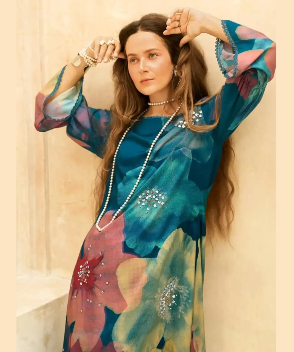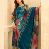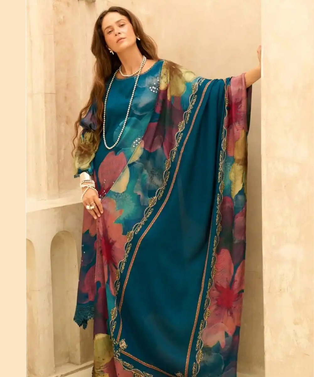 A classy teal blue pure muslin crepe suit featuring large floral prints and a smooth finish. Perfect for those who love elegant and modern ethnic wear.